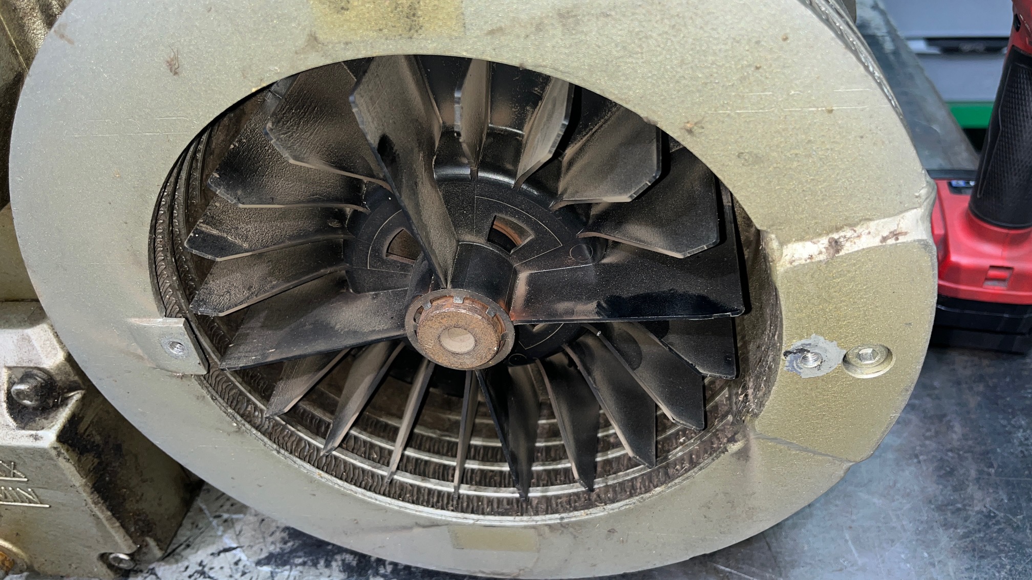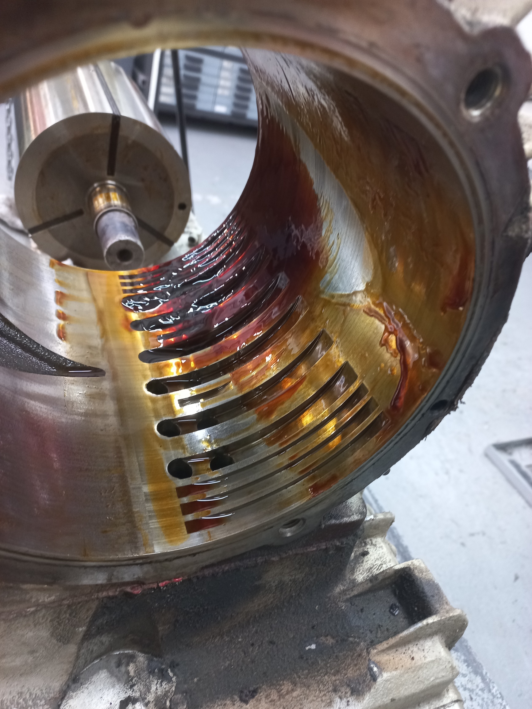 Równolegle wykonywany jest przegląd techniczny silnika elektrycznego, obejmujący test uzwojeń, wymianę łożysk oraz wyważanie wirnika.